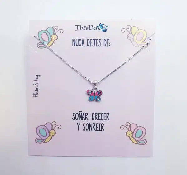 Collar de mariposa con bonito mensaje positivo para las mas pequeñas. Plata de ley y cadena a varias medidas.